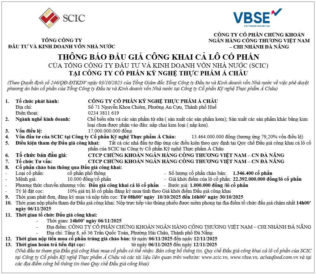 Thông báo Đấu giá công khai cả lô cổ phần của Tổng Công ty Đầu tư và Kinh doanh vốn Nhà nước (SCIC) tại Công ty Cổ phần Kỹ nghệ Thực phẩm Á Châu