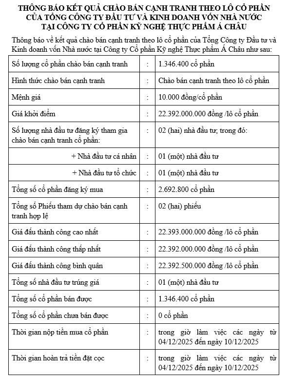 THÔNG BÁO KẾT QUẢ ĐĂNG KÝ THAM GIA ĐẤU GIÁ THEO LÔ CỔ PHẦN CỦA TỔNG CÔNG TY ĐẦU TƯ VÀ KINH DOANH VỐN NHÀ NƯỚC TẠI CÔNG TY CỔ PHẦN KỸ NGHỆ THỰC PHẨM Á CHÂU